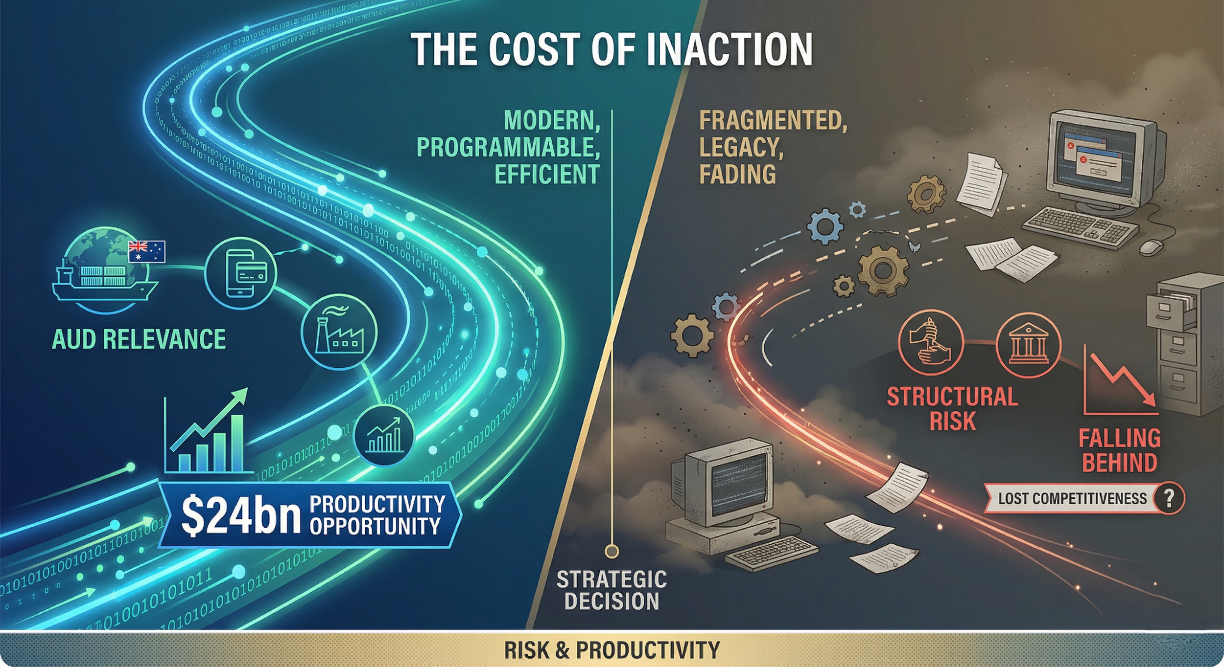 Independent research released in March 2026 by the Digital Finance Cooperative Research Centre quantifies what is at stake for Australia in the transition to digital finance: $24 billion in annual productivity gains, approximately one percent of GDP, available through better markets, better payments, and better assets. Yet on the current trajectory, Australia will capture less than $1 billion of that by 2030. Australia does not yet have the financial guardrails and platforms, custody standards, governance architecture, or sovereign settlement infrastructure required to participate in the next phase of global digital finance on its own terms.